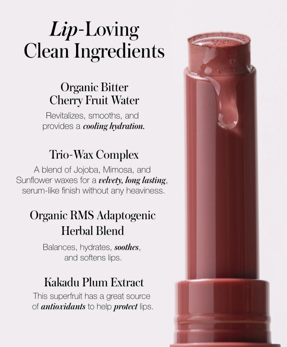 Ruby Moon: *Prunus Cerasus (Bitter Cherry) Fruit Water, Jojoba Esters, Helianthus Annuus (Sunflower) Seed Wax, Water/Aqua/Eau, *Alcohol Denat., Squalane (vegetable), Glycerin, Helianthus Annuus (Sunflower) Seed Oil Unsaponifiables, Silica, Polyglyceryl-4 Caprate, Polyglyceryl-3 Polyricinoleate, Isononyl Isononanoate, Acacia Decurrens (Mimosa) Flower Wax, Polyglycerin-3, Potassium Sorbate, Tocopheryl Acetate, *Vanilla Planifolia Fruit Extract, Polyglyceryl-3 Diisostearate, *Simmondsia Chinensis (Jojoba) Seed Oil, Tocopherol (non-GMO), *Calendula Officinalis (Marigold) Flower, *Equisetum Arvense (Horsetail) Leaf Extract, *Hypericum Perforatum (St. John’s Wort) Flower Extract, *Curcuma Longa (Turmeric) Root, *Hemidesmus Indicus (Country Sarsaparilla) Root Extract, *Withania Somnifera (Ashwagandha) Root Extract, Terminalia Ferdinandiana (Kakadu Plum) Fruit Extract, *Glycyrrhiza Glabra (Licorice) Root Extract, *Olea Europaea (Olive) Leaf Extract, Red 28 Lake (CI 45410), Yellow 5 (CI 19140), Red 6 (CI 15850).